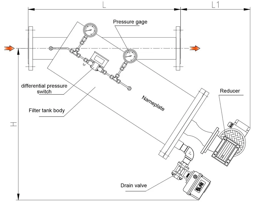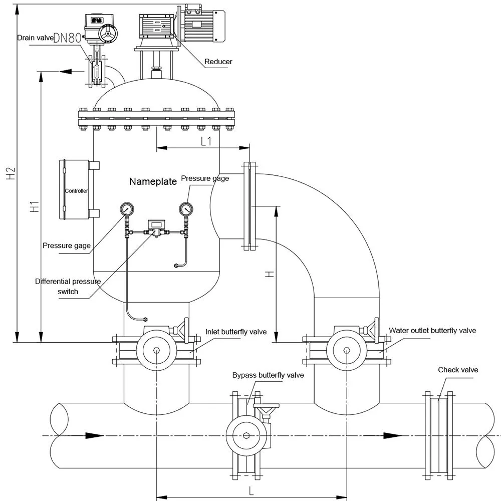 | Model | Inlet/outlet connection (mm) | Max. flow rate (m³/h) | Filtration area (cm²) | Drain valve DN (mm) | D (mm) | Water consumption per cycle (L) | Motor power (kW) | Weight (kg) |