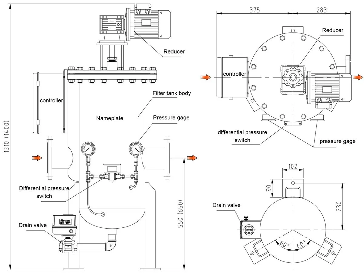 | Model | Inlet/outlet connection (mm) | Max. flow rate (m³/h) | Filtration area (cm²) | Drain valve DN (mm) | D mm | Water consumption per cycle (L) | Motor power (kW) | Weight (kg) |