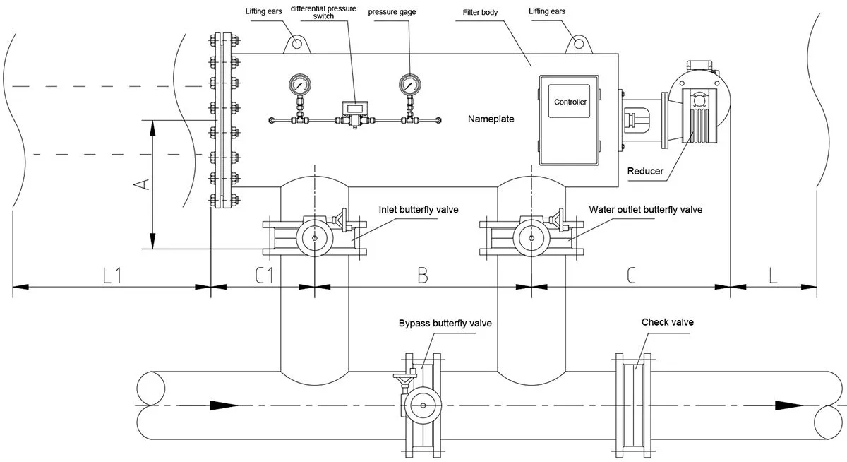 When the self-cleaning brush screen filter recognizes too much dirt building up on the surface of the filter screen as well as a pressure difference between the inlet and outlet water reaching a preset value, it will automatically start its self-cleaning program. This entails the motor driving a rotating brush to remove the dirt buildup from the filter screen and switch on the electric valve for discharging the dirt. This effectively cleans the filter back into its optimal filtering state.